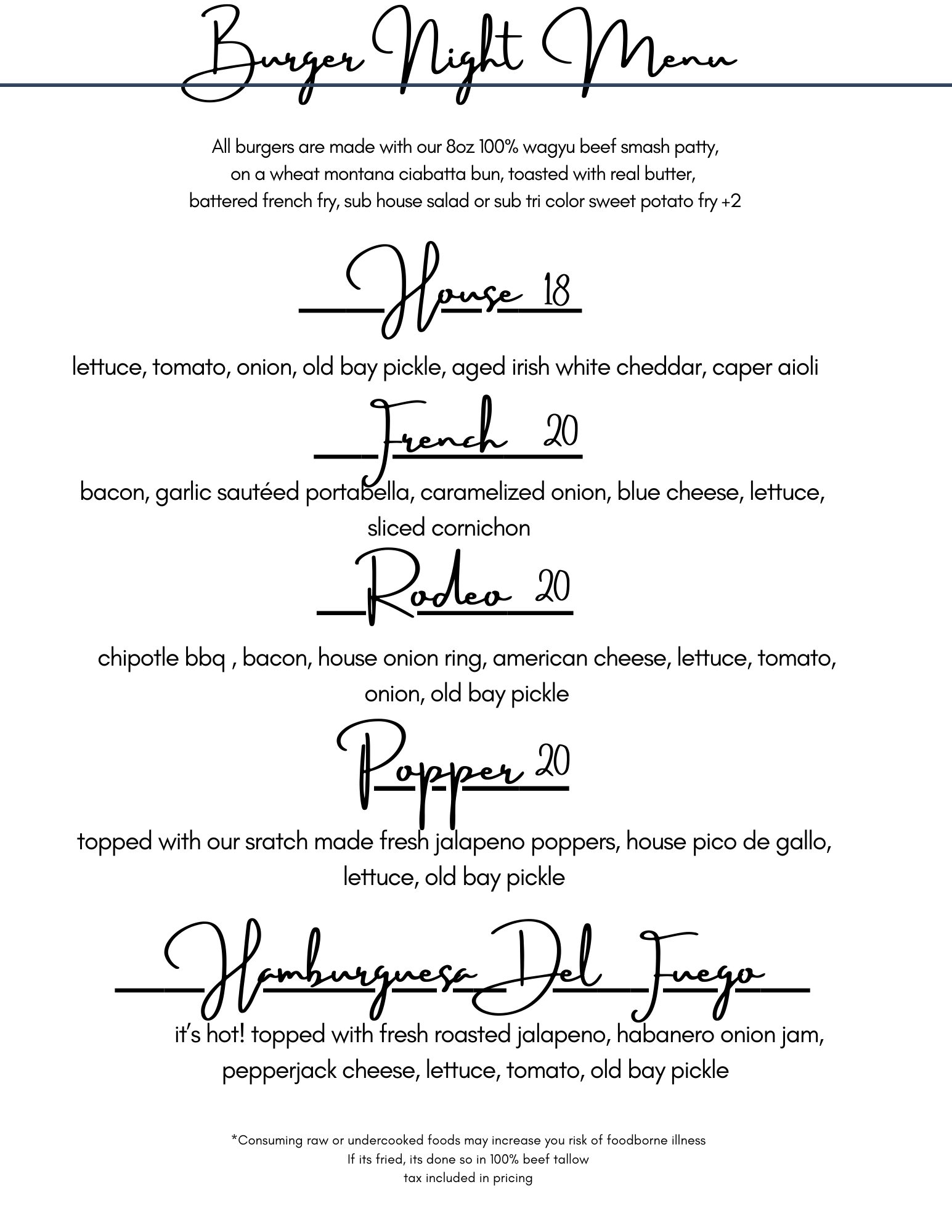 Come on up and join us for burger night at Olive Glenn Golf Club. Sunday night football, rotating specialty burgers with our 8oz 100% wagyu smash patty and ciabatta bun topped in a variety of flavors including some classics. Menu changes weekly and full dinner menu also available